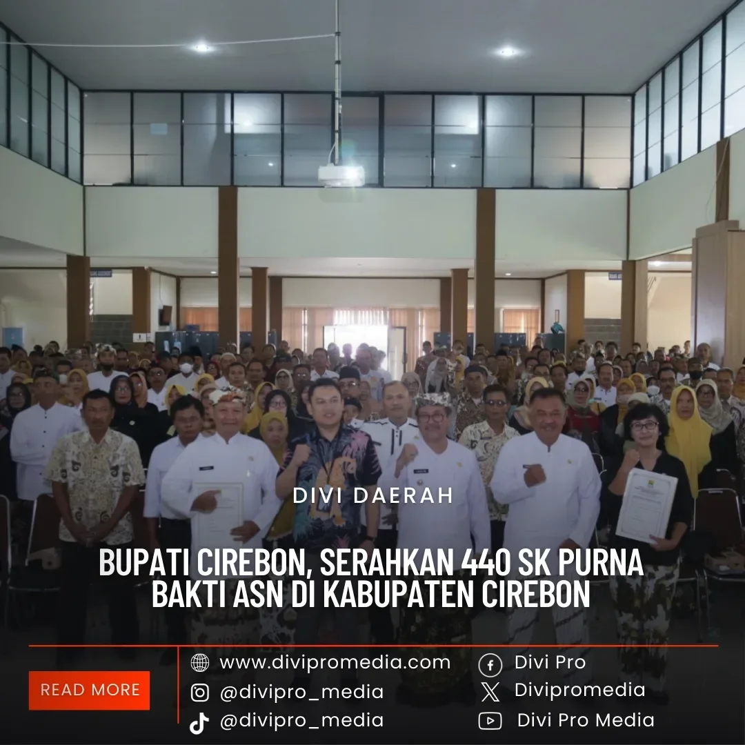 Kabupaten Cirebon, (divimedia.com)- Bupati Cirebon H.Imron, menyerahkan Surat Keputusan (SK) purna bakti, untuk 440 Aparatur Sipil Negara (ASN) di Kabupaten Cirebon, yang memasuki masa apensiuan pada tanggal 1 April – 31 Desember 2023.
