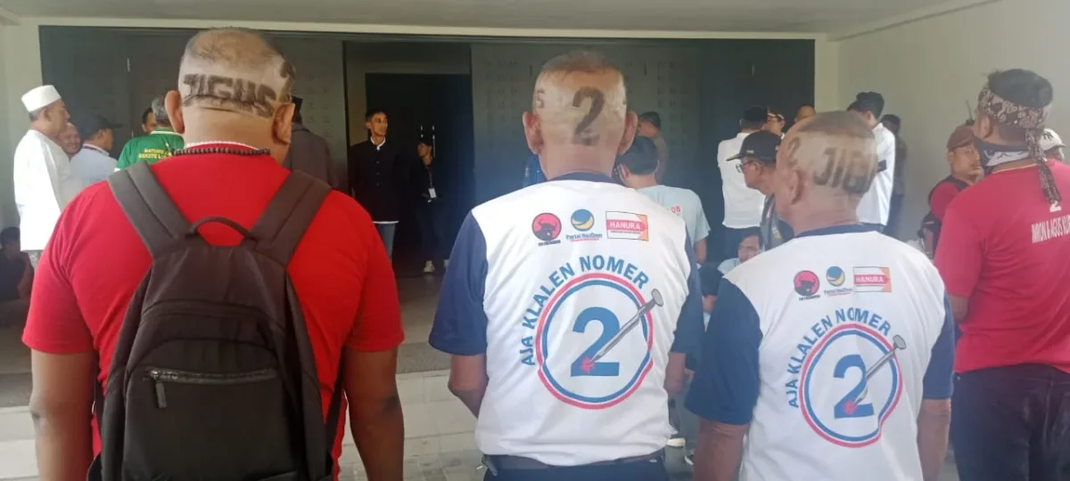 Beberapa relawan menunjukkan gaya rambut yang diukir dengan angka “2” dan tulisan “Jigus,” menciptakan kehebohan di pintu masuk debat.