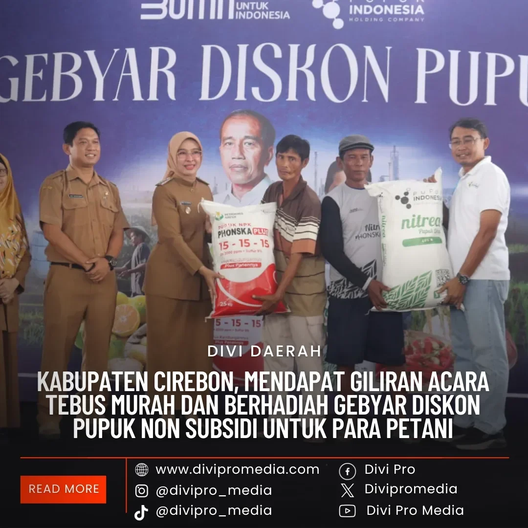 Dalam rangka menjaga ketersediaan pupuk, Kementerian BUMN dan Kementerian Pertanian melalui Pupuk Indonesia menggelar program Gebyar Diskon Pupuk di berbagai kota/kabupaten selama bulan Januari sampai dengan Februari 2024. Saat ini, kegiatan dilaksanakan di Gudang Pupuk Kini III Kedawung Kabupaten Cirebon.